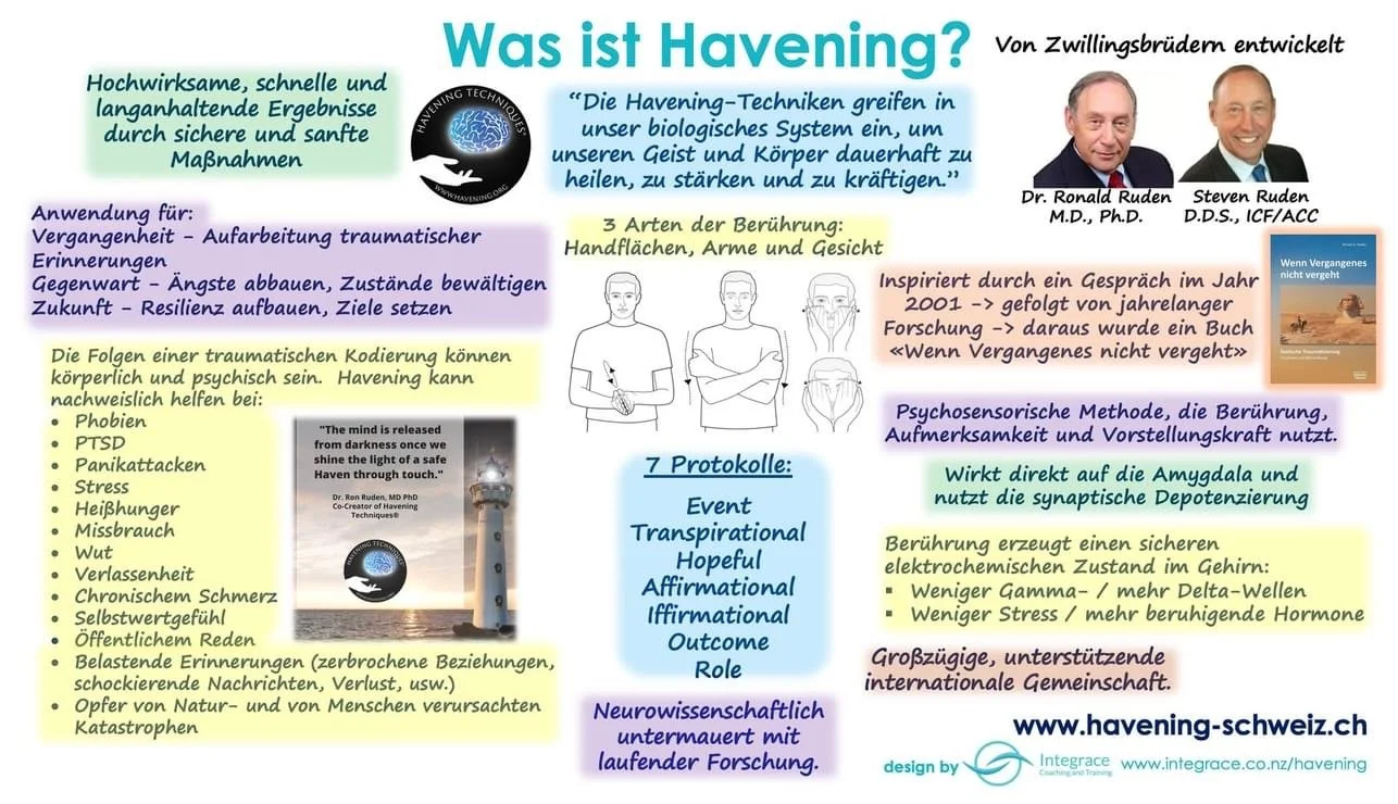 Havening ist eine kraftvolle und wirksame psychosensorische Technik, die hilft, emotionale Blockaden zu lösen, belastende traumatische Erinnerungen zu neutralisieren, die Selbstregulation zu stärken und Resilienz auszubauen. Darüber hinaus ist Havening unterstützend für das persönliche und berufliche Wachstum.